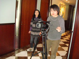 のシーンで緊急事態発生!ドリーを取り付けた三脚が突然転倒、カメラのレンズからおもいっきり床に叩きつけれられた・・・しかし幸いにも、レンズより前に出ているマイクが緩衝材となり、奇跡的に本体は無事。マイクは折れてしまったものの機能的には問題なく、撮影は無事完了。